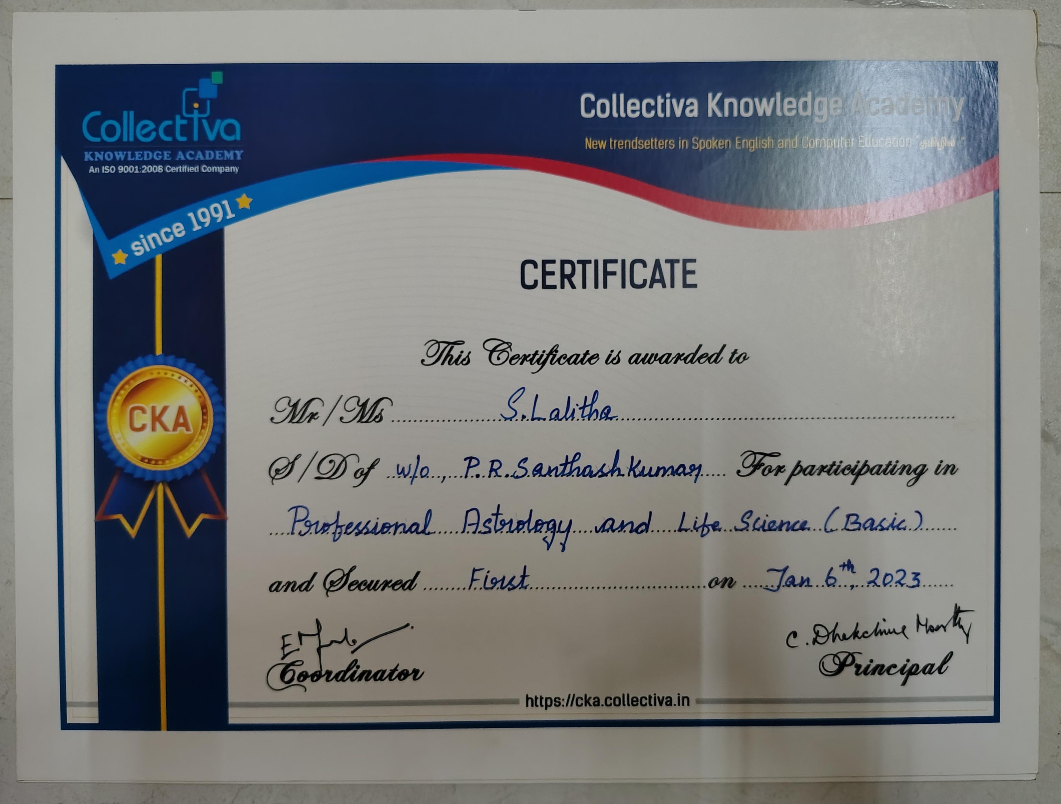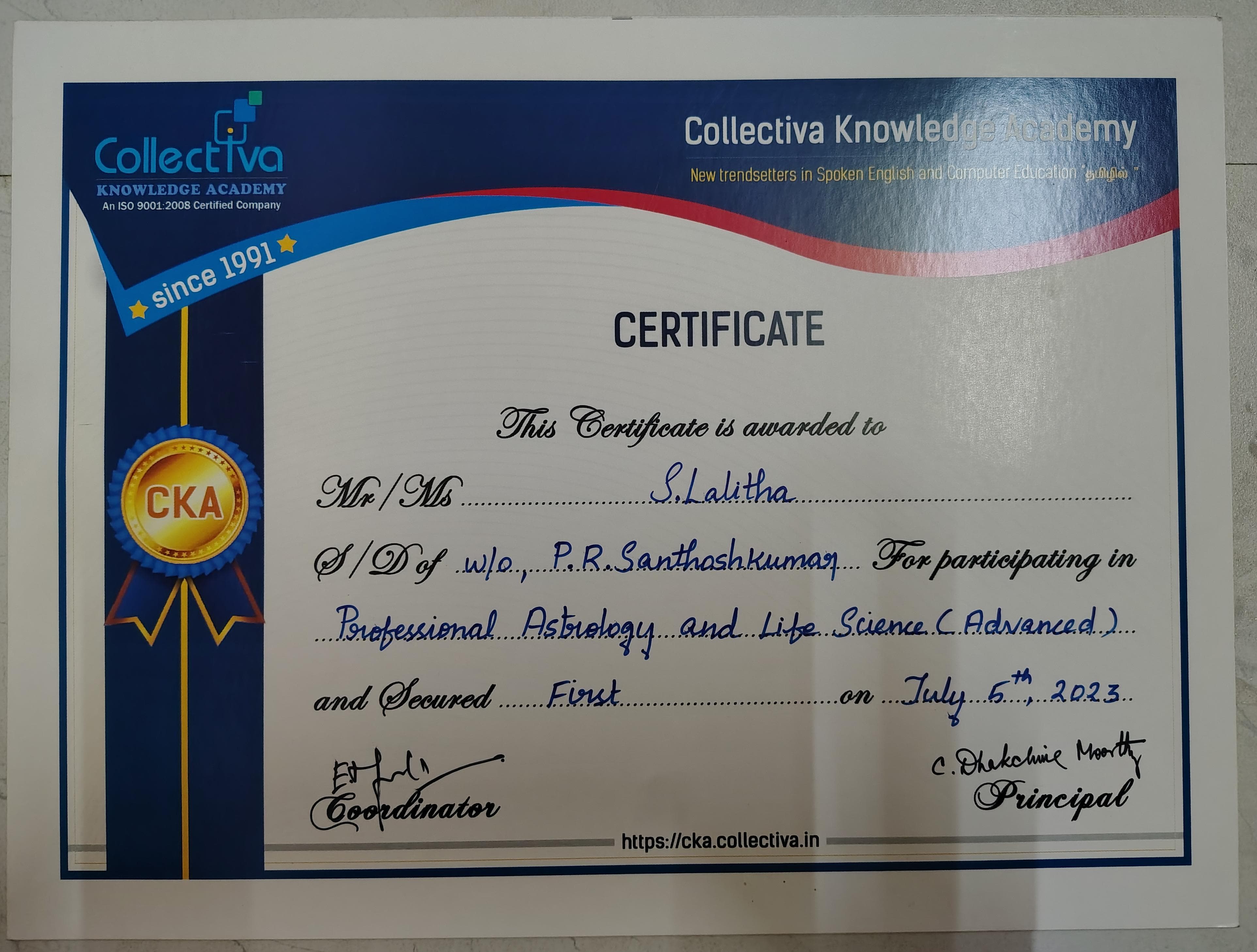 தொழில்முறை ஜோதிடம் மற்றும் வாழ்க்கை அறிவியல் (Advanced): திருமதி S. லலிதா அவர்கள் கலெக்டிவா நாலேஜ் அகாடமியில் ஜோதிட தொழில் பழகு என்ற வகுப்பில் பயின்று தேர்ச்சி பெற்று ஜூலை 5, 2023 அன்று சான்றிதழ் பெற்றுக் கொண்டார்.