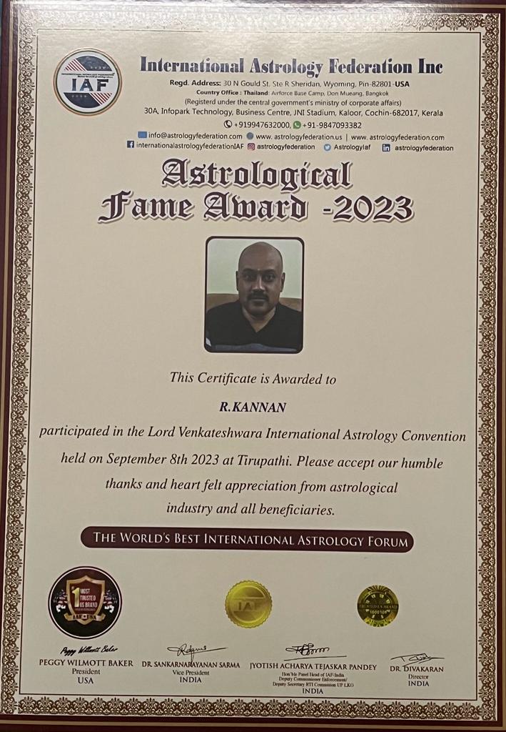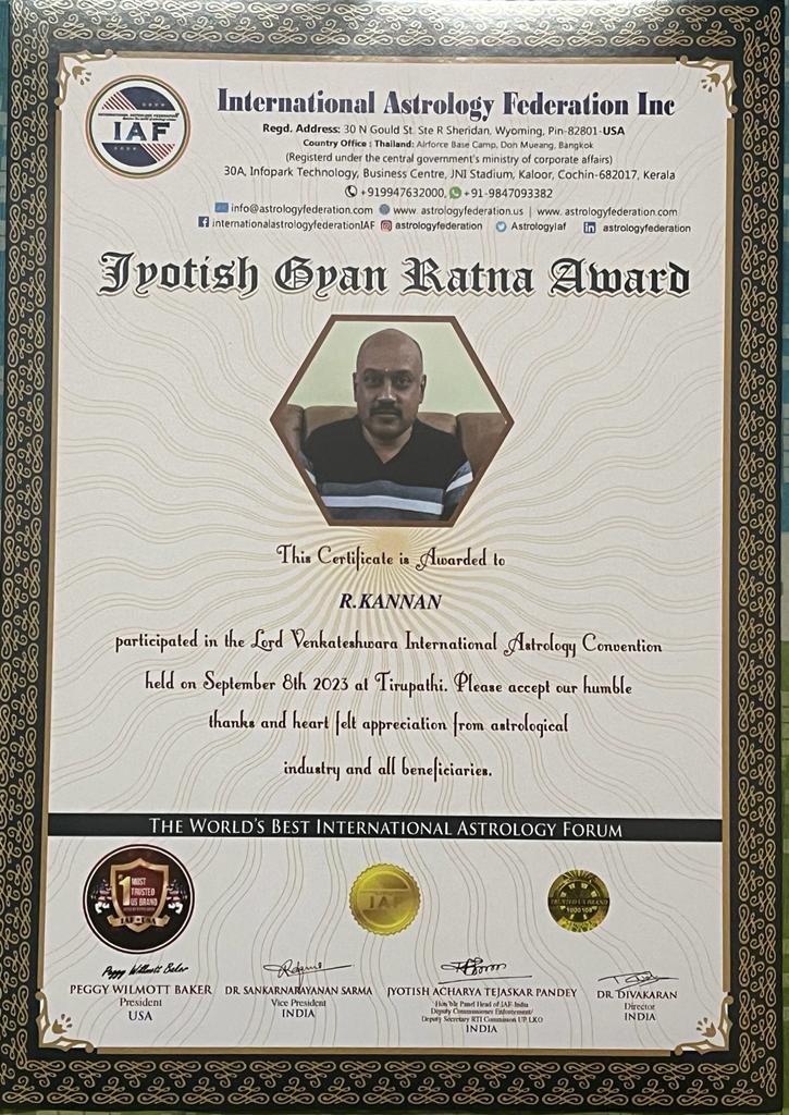 08 Feb 2026"Mr.Kannan ia an astrologer whose predictions are absolutely excellent. Iam very much pleased and satisfied with his work of astro and wishing him great luck for his continuing success for current and future astrology tenures. Once again my whole family is thankful to him. Keep up your great work sir. Will definitely share my experience with family and friends."