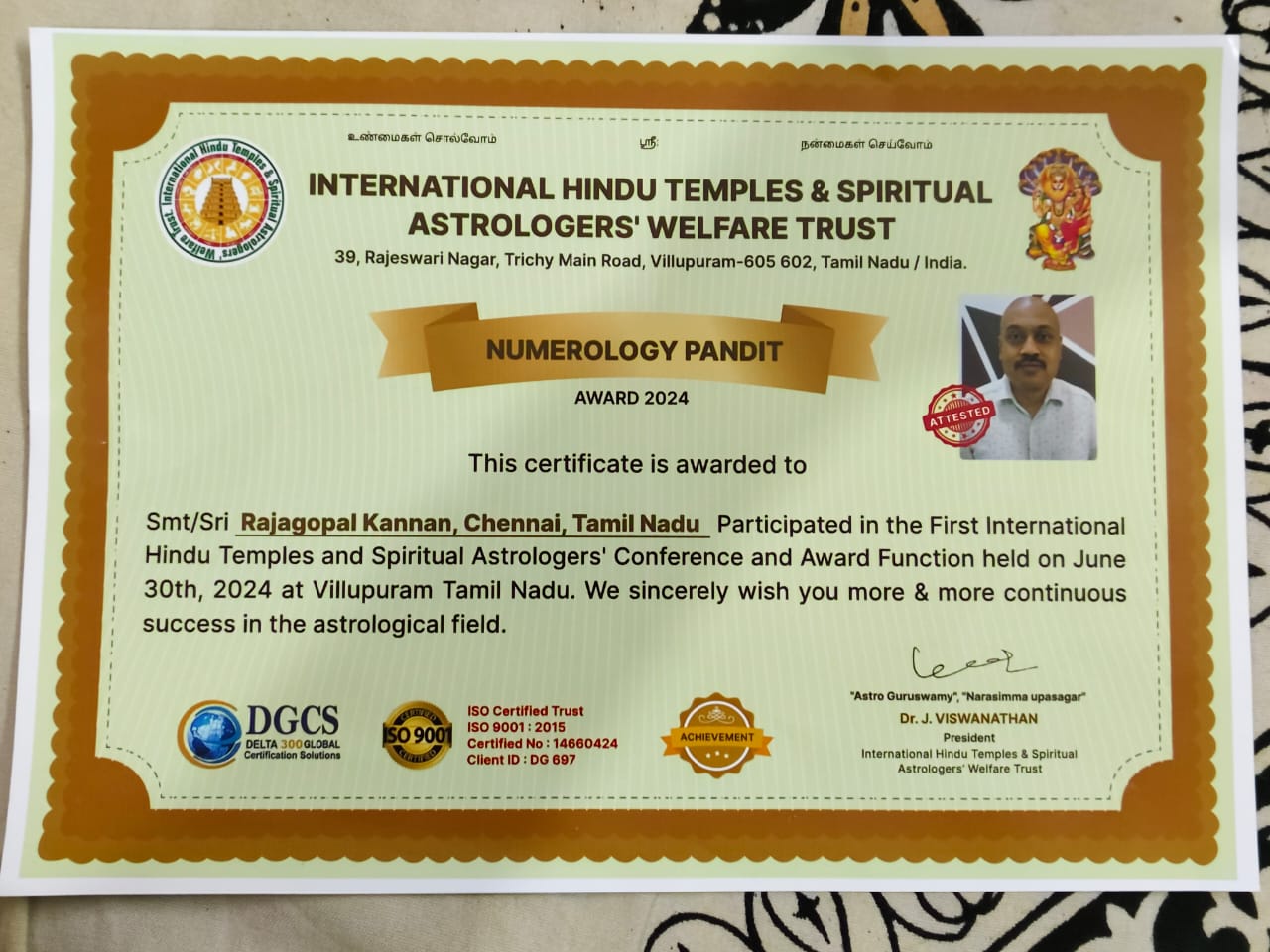07 Feb 2026"Mr. Rajagopal Kannan has been our family’s most trusted and authentic astrology & numerology consultant for years. Have been taking his advice and consultations for both my family and for my business astrological guidances and benefited immensely. Highly recommend his services. "